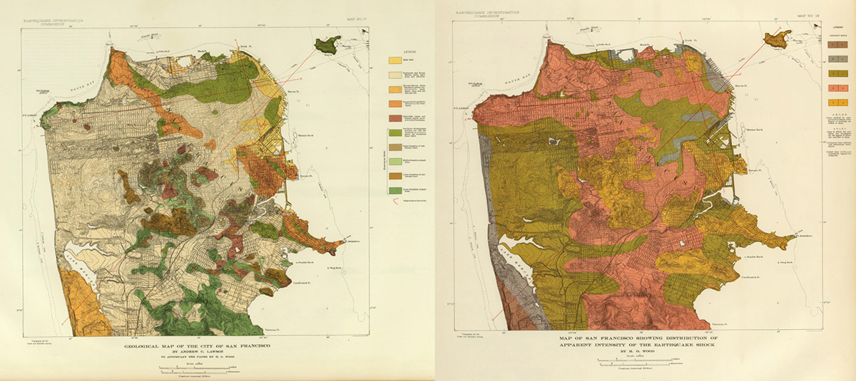 Μετά τον καταστροφικό σεισμό του 1906 στο Σαν Φρανσίσκο, οι γεωλόγοι συνέκριναν χάρτες των πιο κατεστραμμένων περιοχών με χάρτες των τοπικών γεωλογικών σχηματισμών. Η εικόνα προέρχεται από τη συλλογή χαρτών David Rumsey, το κέντρο χαρτών David Rumsey, τις βιβλιοθήκες του Stanford.