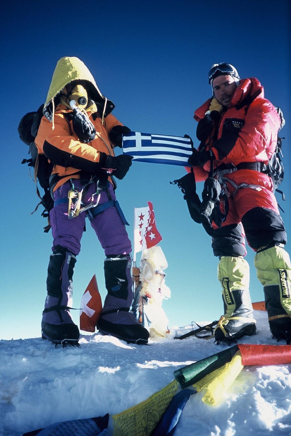 Στη διάρκεια της τελικής ανάβασης, ξεκουραστήκαμε μόνο μισή ώρα. Σε απορροφά η δράση, το επόμενο βήμα, το επόμενο κομμάτι. Εκεί ήρθε το φως. Ήταν τόσο εντυπωσιακό: βλέπαμε από τη μια πλευρά την Ινδία και από την άλλη το Θιβέτ. Το μέτωπο του ήλιου κατάπινε το σκοτάδι. Βλέποντας ότι φτάνω στο στόχο ένιωσα ανακούφιση, δέος. Και μαζί συγκίνηση, διότι πρόσφατα είχα χάσει και τους δυο μου γονείς που, παρότι ήξεραν πως αυτό που έκανα ήταν επικίνδυνο, με στήριζαν πολύ. Κάθησα στην κορυφή γύρω στα 20 λεπτά. Ήταν πανέμορφα στο υπόφως του πρωινού. Έβλεπα όπου έφτανε το μάτι μου. Ύψωσα την ελληνική σημαία, φωτογραφήθηκα με αυτήν, άφησα μια φωτογραφία του Χρήστου Μπαρούχα, που θα ’θελα να ήταν μαζί μας, και μετά άρχισα να κατεβαίνω. Οι υπόλοιποι πέντε της ομάδας έφτασαν περίπου δυο ώρες μετά –τους συνάντησα κατεβαίνοντας. Η βόρεια αποστολή έφτασε δυο μέρες μετά.